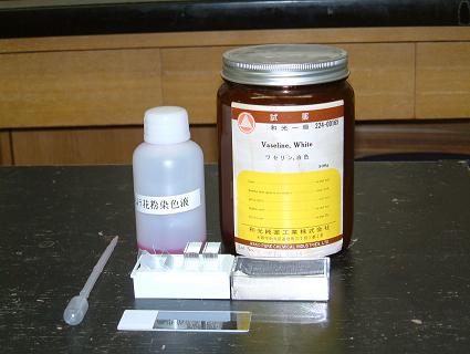 | 4)標本を作るための薬品など。スライドグラス、白色ワセリン、染色液 etc。 | |